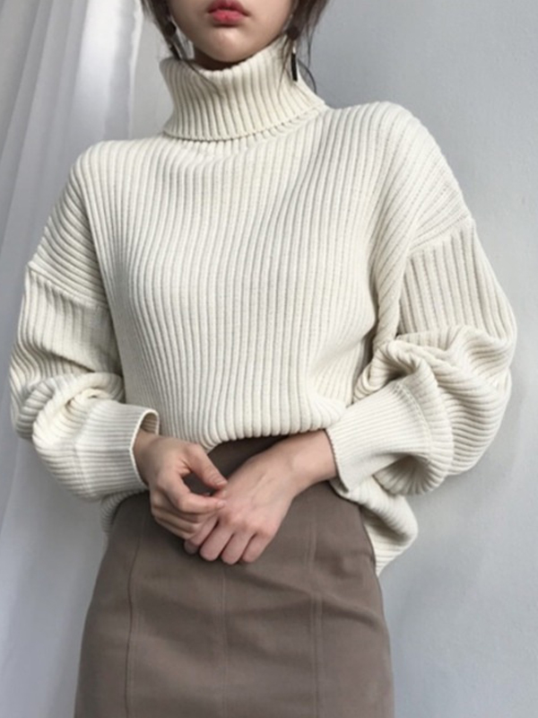 Solid Turtleneck Ribbed Knit Sweater