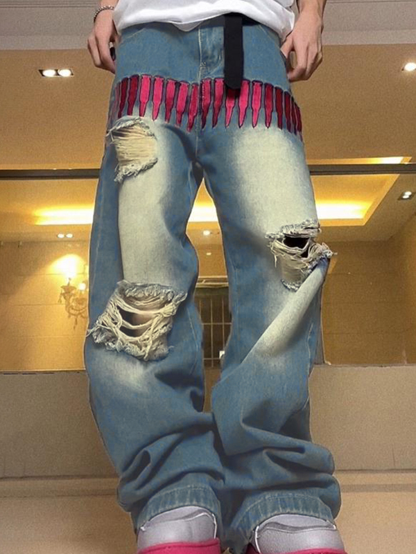 Men’s Pink Bullet Embroidery Ripped Loose Jeans