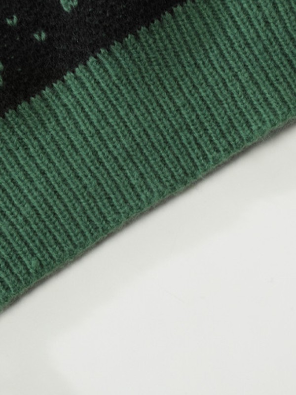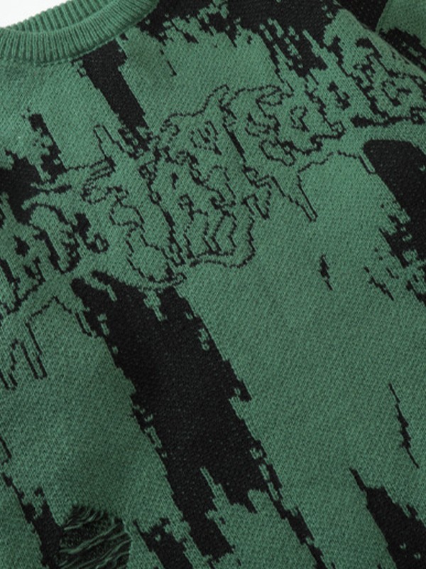 Description: Features a design of dark pattern jacquard allover, these cosy punk-vibe jumpers cut to a relax silhouette, made from acrylic knit fabric, with dropped long sleeves, and frayed rip holes design.