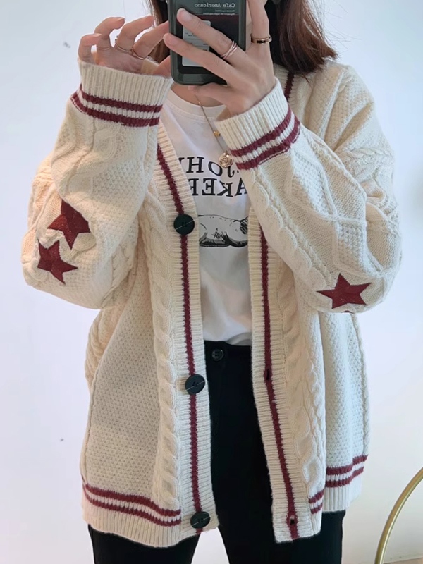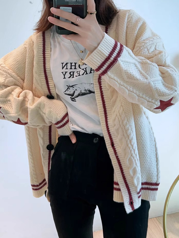 Description: Star things may add some fun to your winter outfits. These cosy knitwears cut to a super flattering silhouette, features star embroidered, contrast striped detail and drop shoulders design, ended with button fasten to the front.