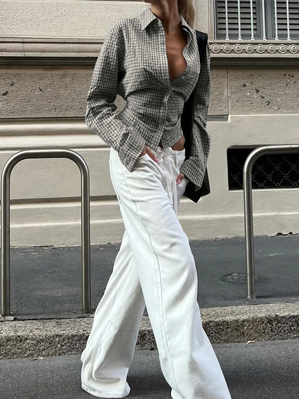 Be the first to review “Turned-Up V-Neck Plaid Shirt Long Sleeves”