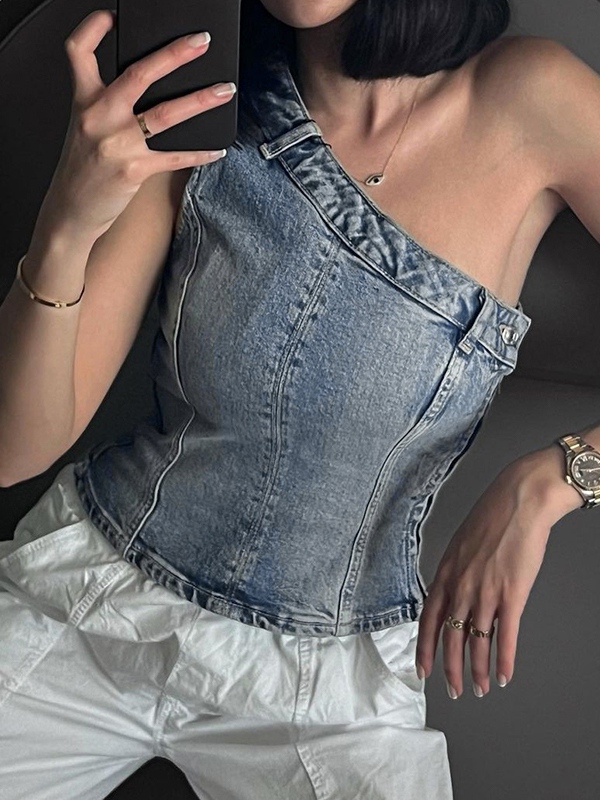 Vintage Denim One Shoulder Slim Bandeau Top
