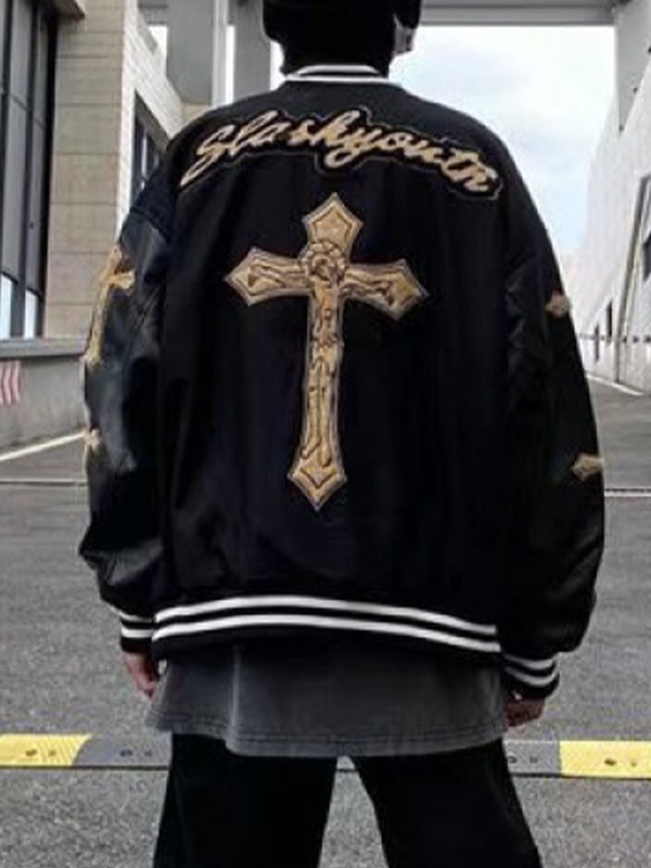 Men’s Cross Embroidery Print PU Leather Patch Jacket