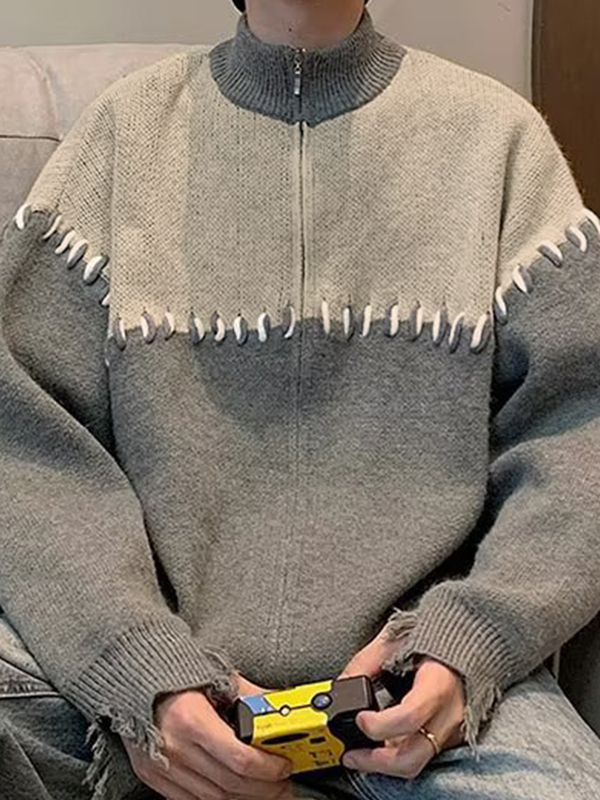 Men’s Splice Tattered Design Zip Up Knit Jacket
