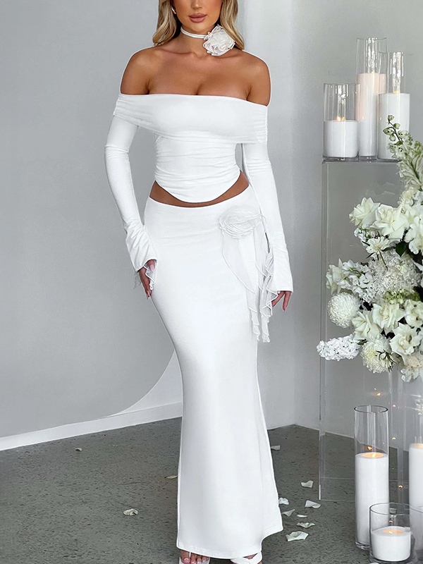 Solid Off Shoulder Tee&Three-dimensional Flower Skirt Set