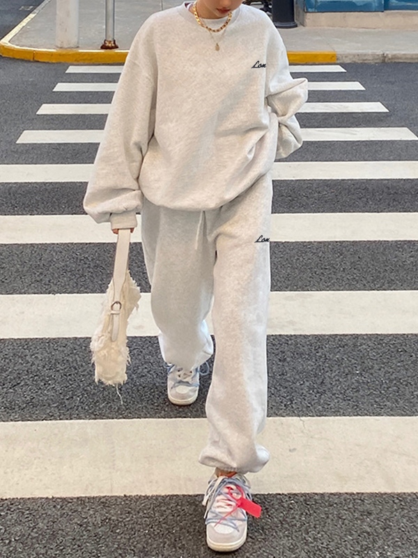 Solid Crew Neck Sweatshirt&Bound Feet Sweatpants Set