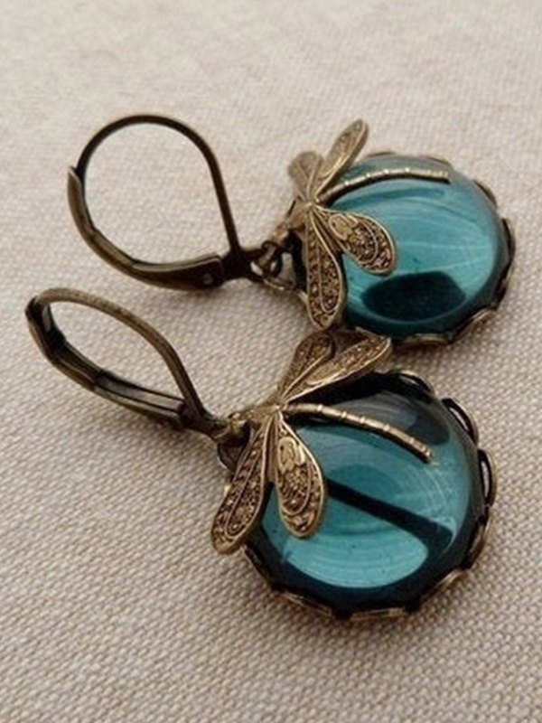 Vintage Dragonfly Stone Pendant Hoop Earrings