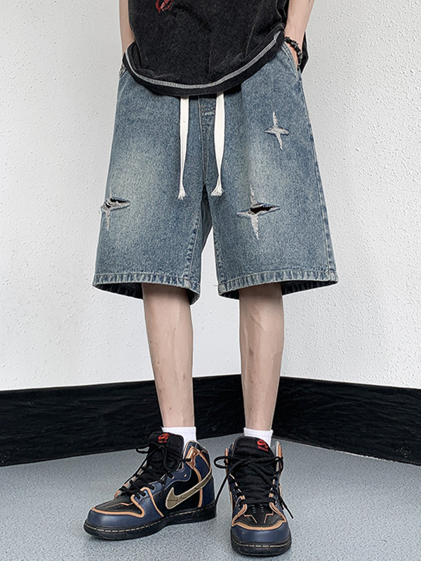 Men’S Washed Ripped Straight Denim Shorts